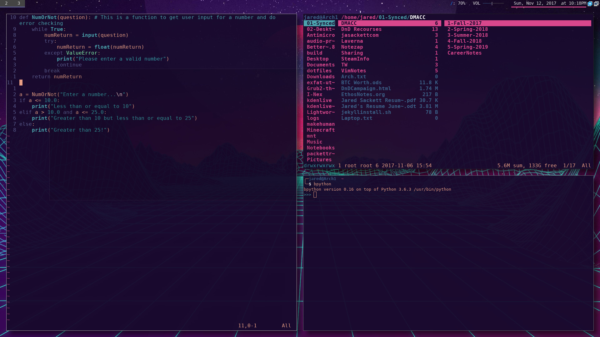 By far one of the most useless, but most entertaining things I’ve set up is my Desktop switcher. In Ranger, I have a custom keybinding (s,b,g) that runs a script to set my background to whatever image I have selected. Additionally, it uses PyWal to generate a custom color scheme based on the colors in the background so everything looks pretty. I often change my backgrounds, and when I have favorites I put a 00- at the beginning of the filename so they show up at the top of folders.